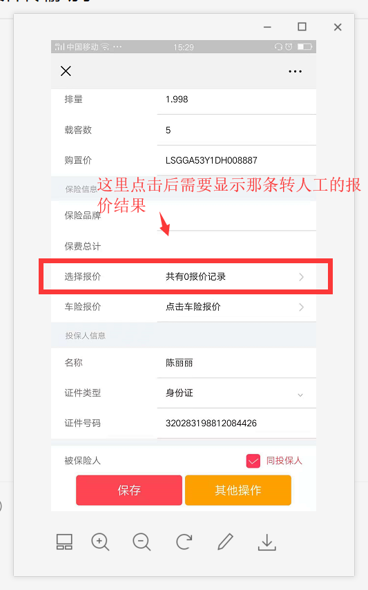 报价结果.png:是转人工后的投保单详情,选择报价处应该显示上图中选择的保险品牌的报价结果
