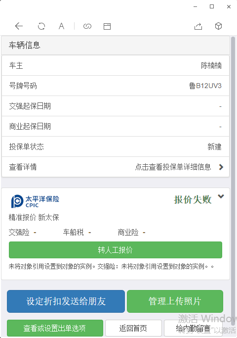 太保中可以报出价格,微信报价提示“未将对象引用设置到对象的实例”,详情见图。