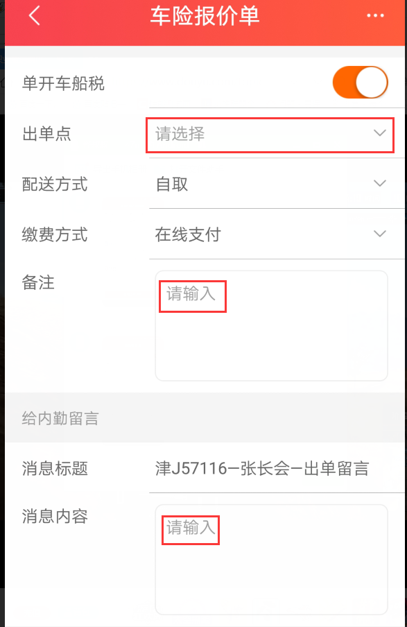 车险报价完成后,点击确认出单。出单账号无法选择,备注和消息的提示不要为请输入,建议改成与备注和消息有关的字眼
