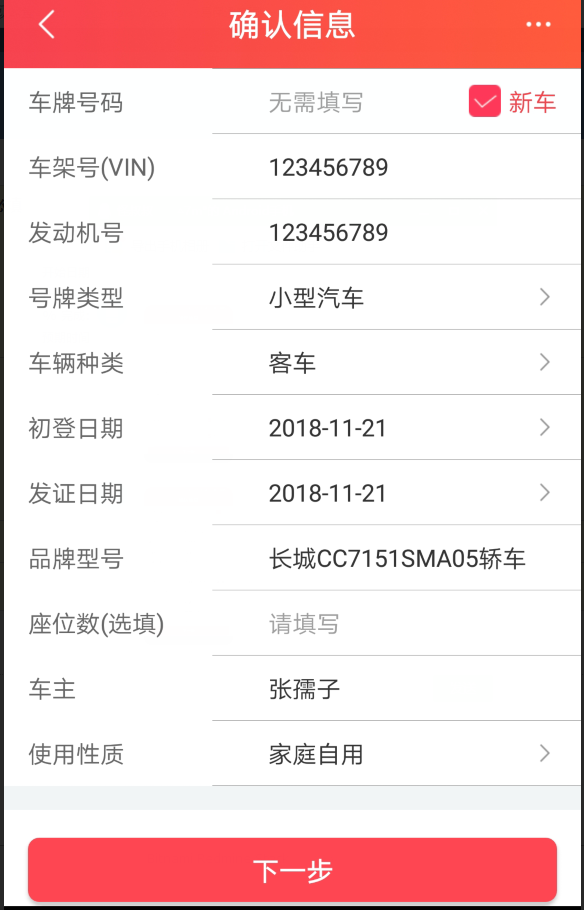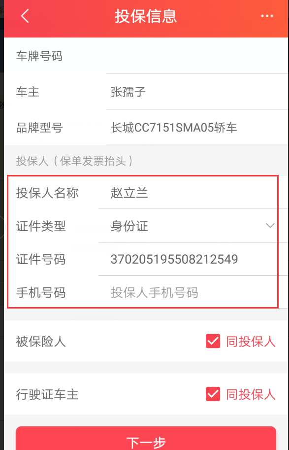确认信息界面填完信息后点击下一步,投保信息界面的投保人出现赵玉兰,毫无干系的一个人