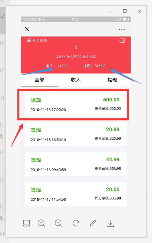 【信通车友】积分提现,用户提现的600积分没有加到收入中