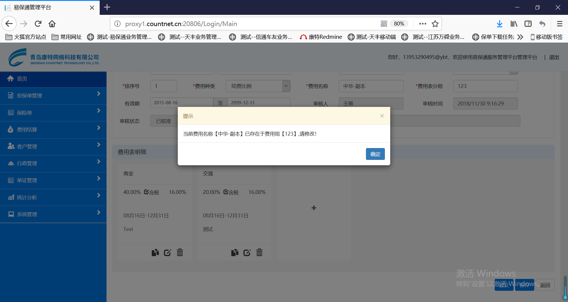 经排查,发现费用表【中华-副本】在数据库中存在两条,但是列表显示一条,所以提示已存在。cs没有对重复进行判断,当存在两条一样的费用表后,在bs进行编辑时就会提示已存在。