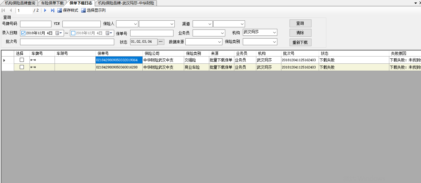保险公司可查询到保单,系统内批量下载失败提示:未找到保单详情,见图