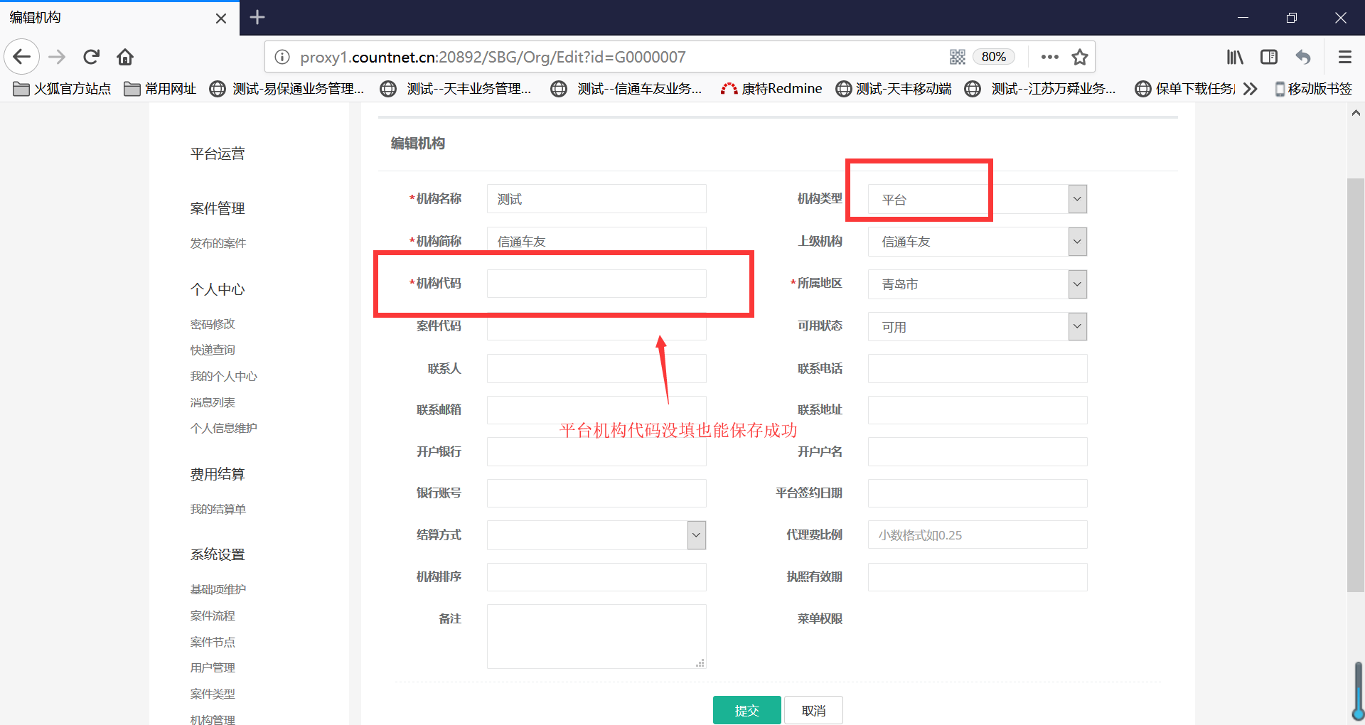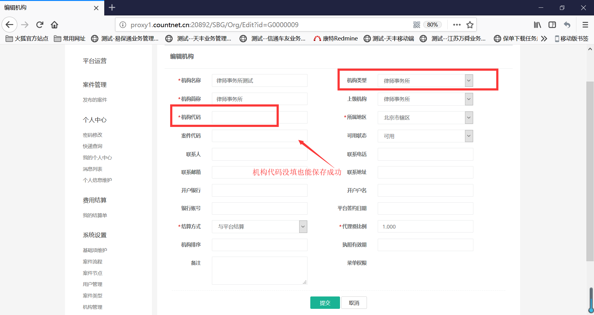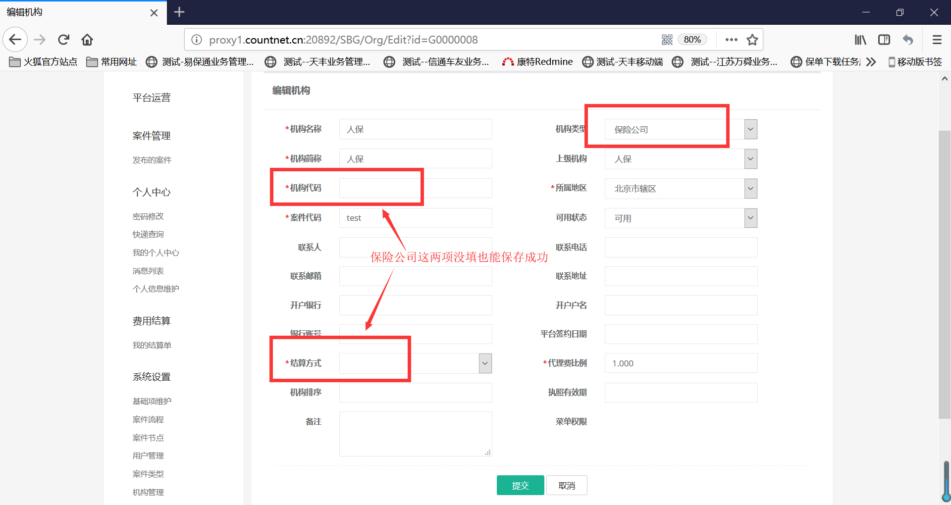 针对三种机构类型分别有不同的必填项,必填项没填仍能保存成功