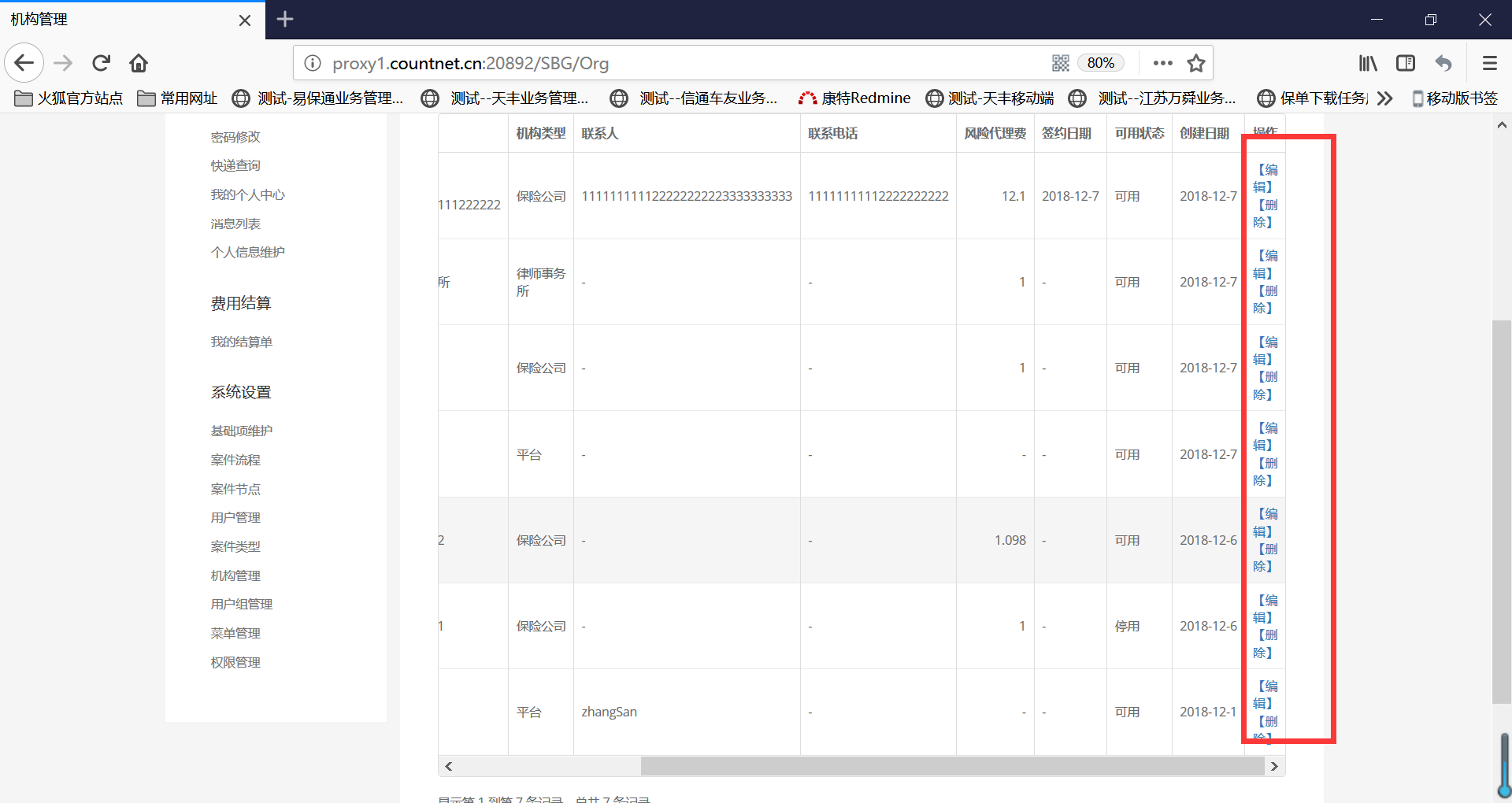 本页面可能数据内容较长的只有机构名称和联系人,仅限制操作不换行,其他列可以换行。
