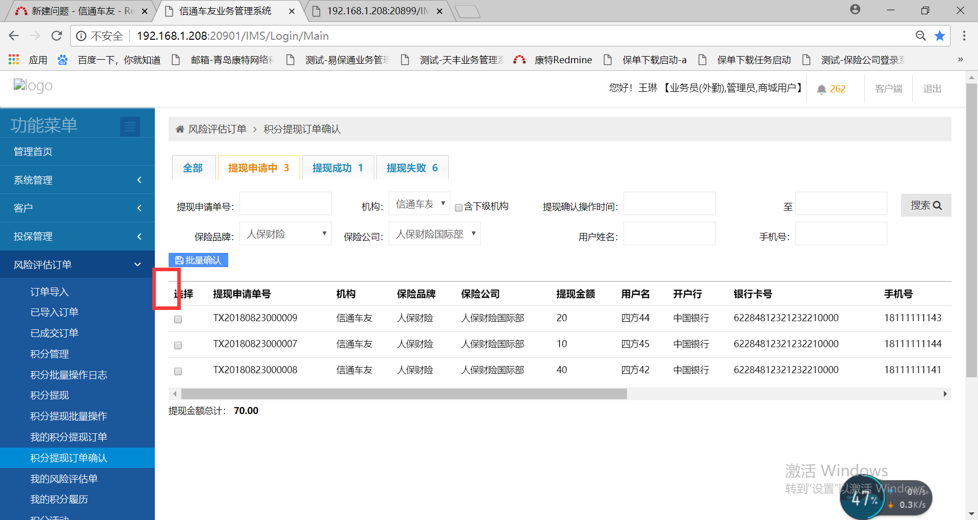 批量确认时,在标签“提现申请中”下加如全选按钮。加入位置如附图