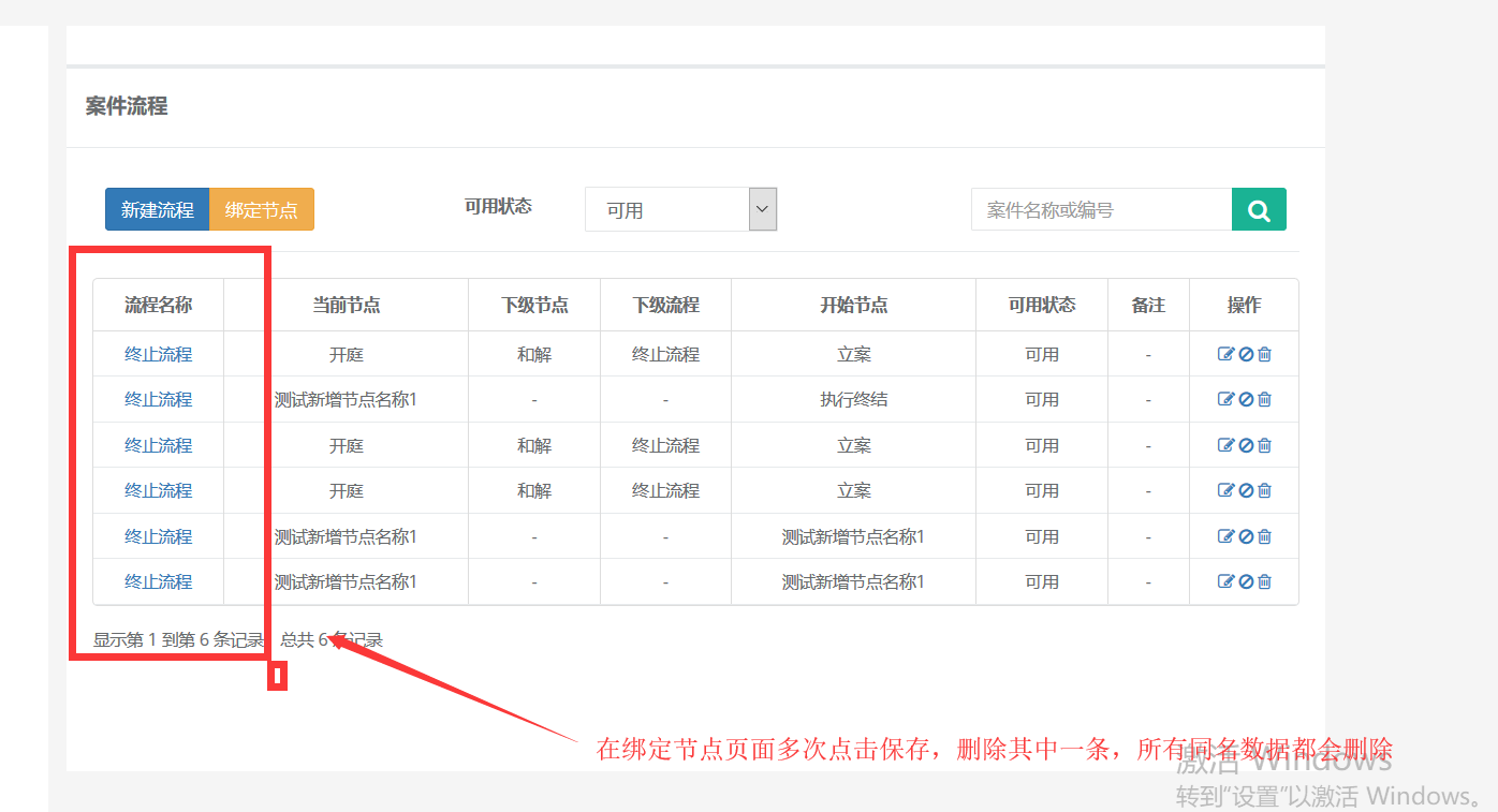 流程名称不能重复限制的是流程表名称,这里可以重复绑定出现是因为基于需求给客户显示的关系表,删除一条导致多条同名流程关系删除是因为之前定的是删除流程删除所有关系,因为展示的是关系所以出现了删一条所有同名流程都会被删除,现在已经对于逻辑进行更改,用户现在删除为关系删除,不会再出现之前批量删除的问题。