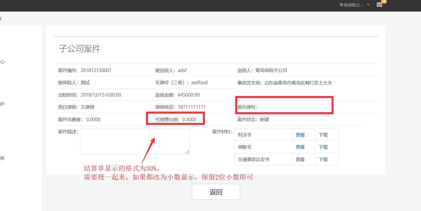 存在问题:1. 案件被委托后,委托机构没有显示。2. 比例格式需要统一一下,见附件详情