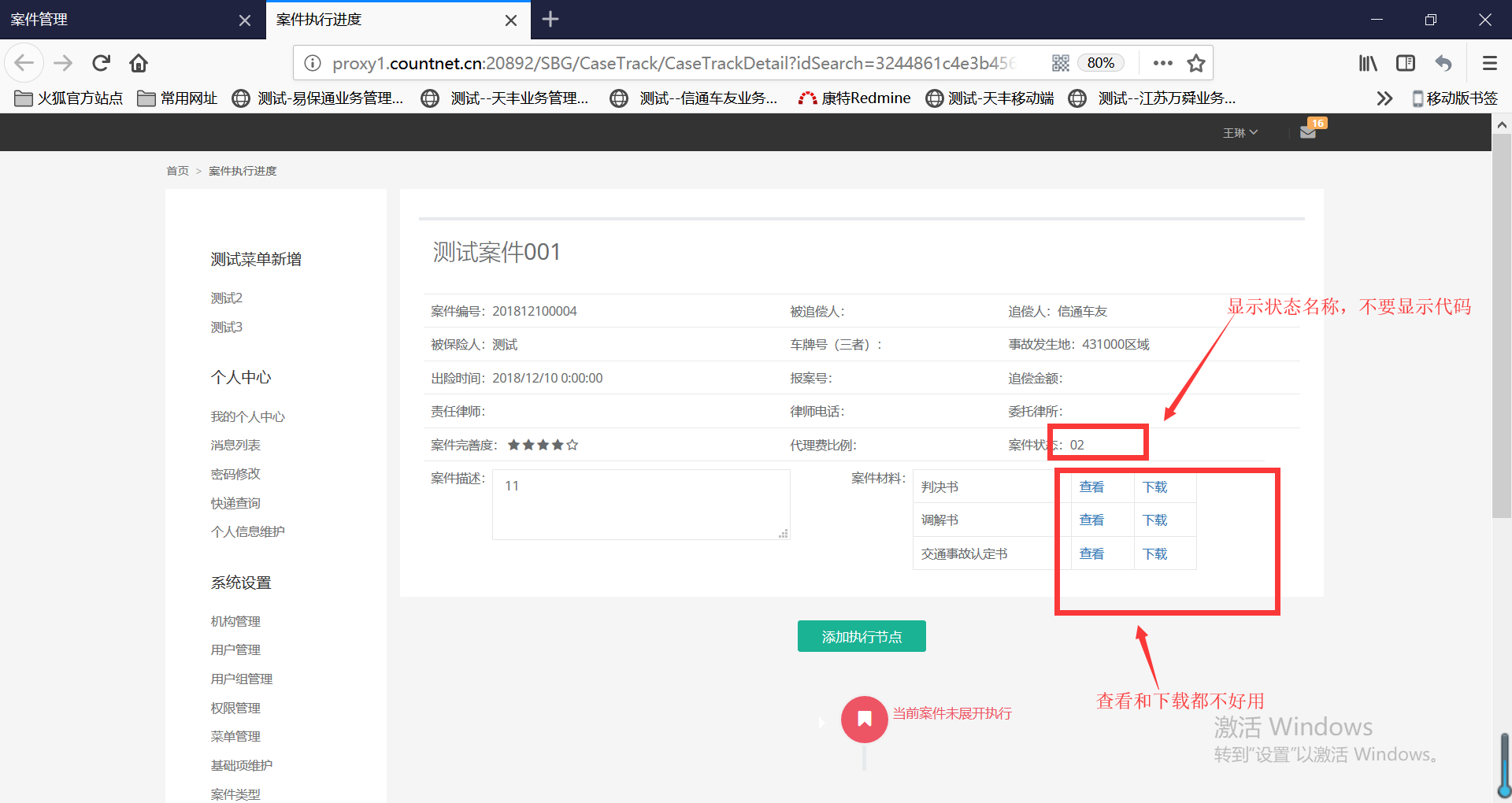 1. 案件状态需要显示名称2. 上传的案件材料查看和下载都不好用,点击无反应