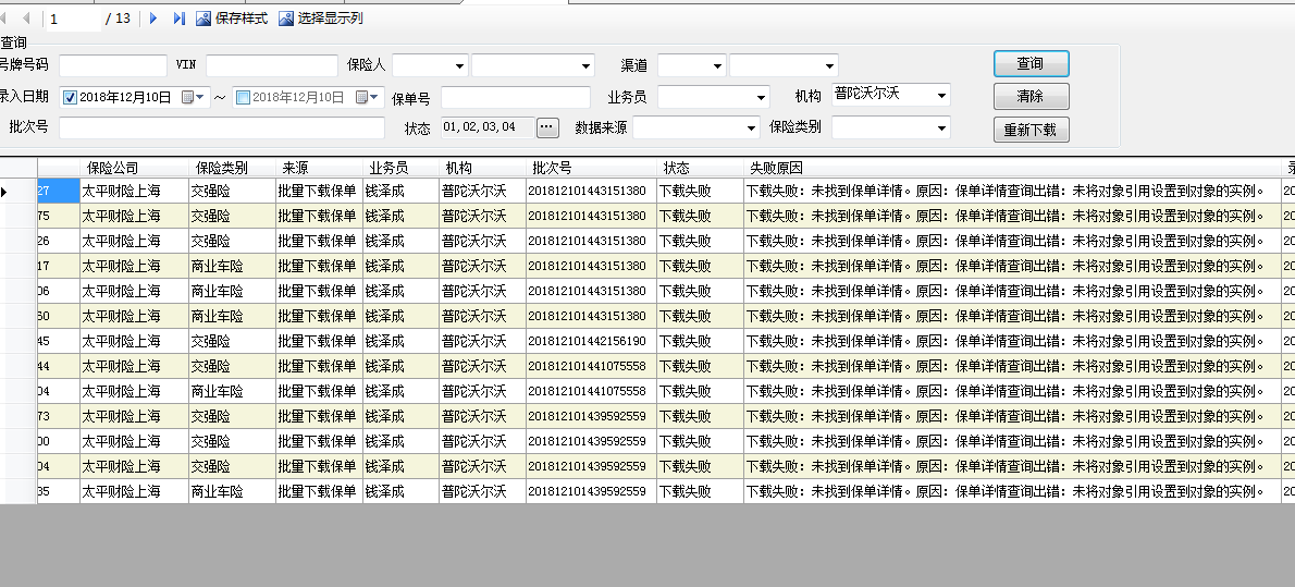 系统为批量下载保单失败,提示:下载失败:未找到保单详情。原因:保单详情查询出错:未将对象引用设置到对象的实例。