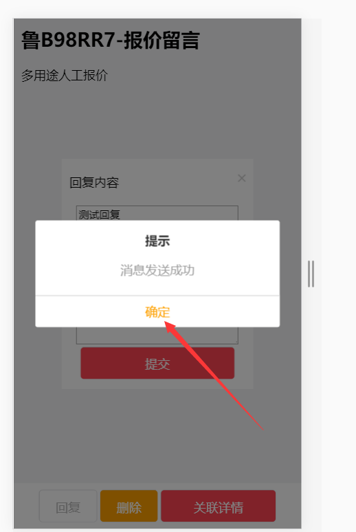 消息中,点击回复->弹出回复内容框,输入内容点击提交,发送成功后点击确定,需要关闭回复内容框