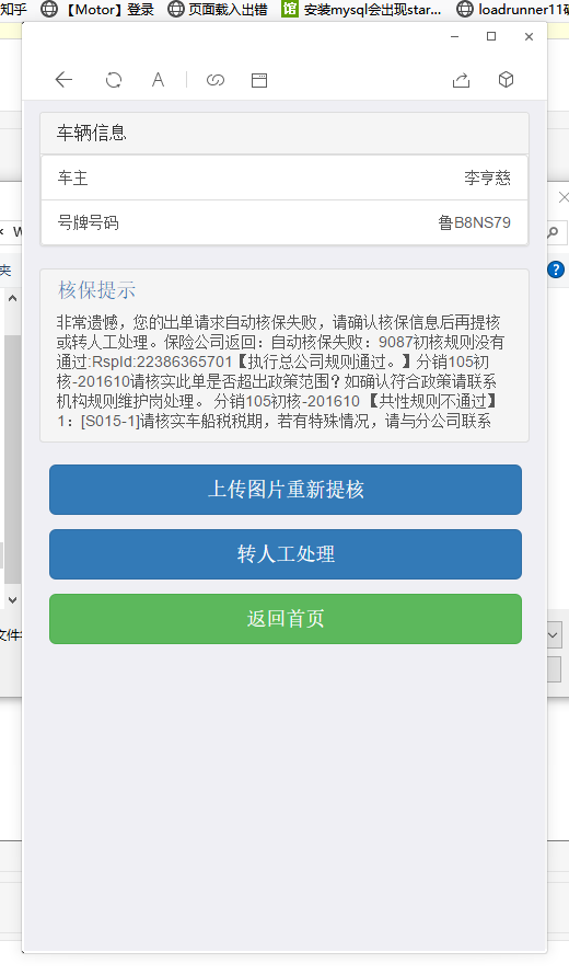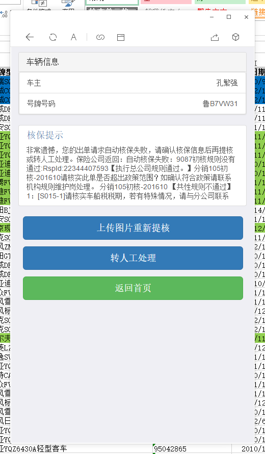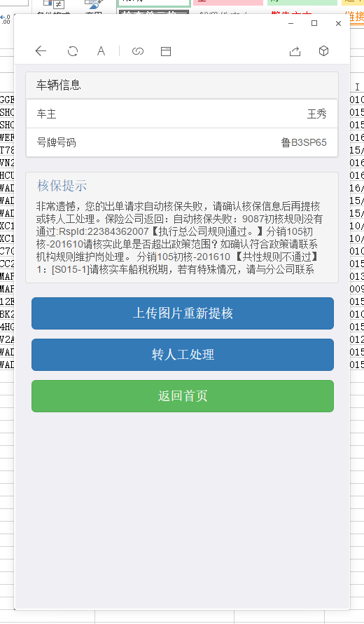 提示信息:非常遗憾,您的出单请求自动核保失败,请确认核保信息后再提核或转人工处理。保险公司返回:自动核保失败:9087初核规则没有通过:RspId:22345365676【执行总公司规则通过。】分销105初核-201610请核实此单是否超出政策范围?如确认符合政策请联系机构规则维护岗处理。 分销105初核-201610 【共性规则不通过】 1:[S015-1]请核实车船税税期,若有特殊情况,请与分公司联系