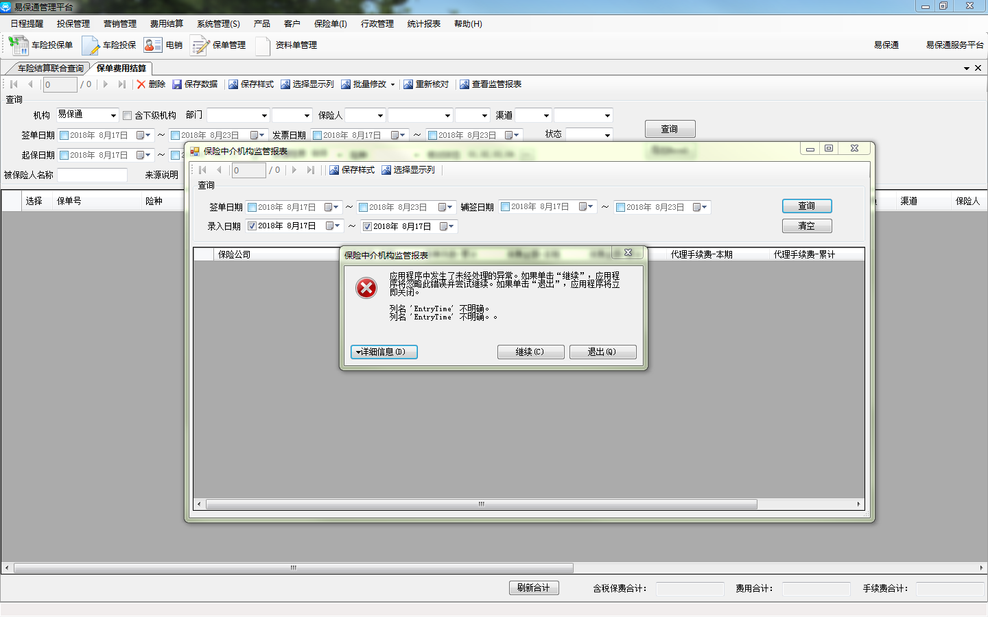 【易保通】费用结算-》保单费用结算-》查看监管报表,查询条件为“录入日期”时,系统提示“列名EntryTime不明确”。