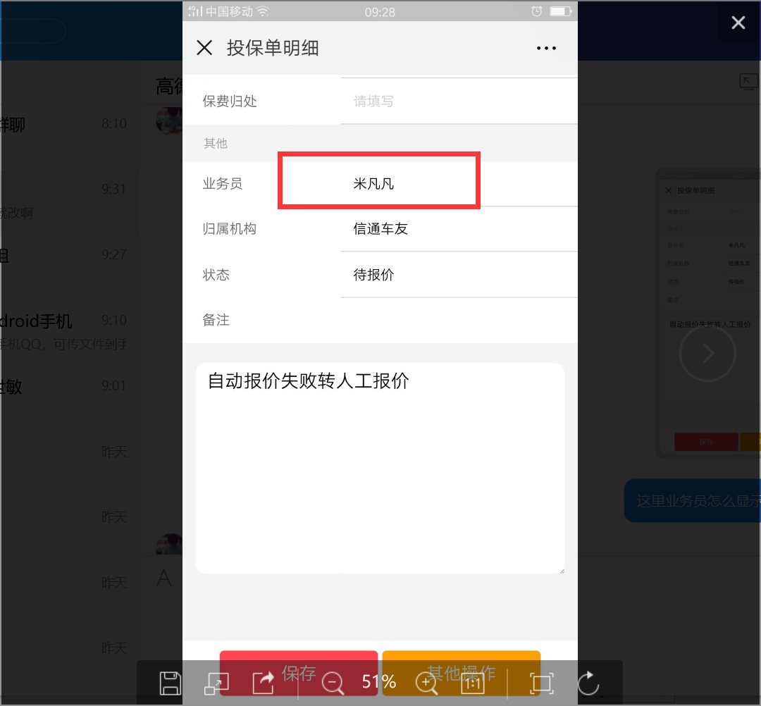 使用的微信登录,车险报价后业务员显示不正确,见附图