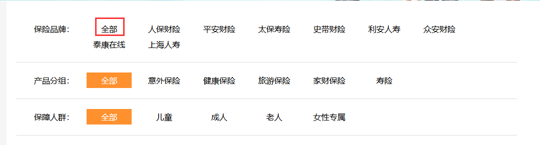 点击“还要买”跳转到保险产品界面,保险品牌的“全部”标签没有自动选择