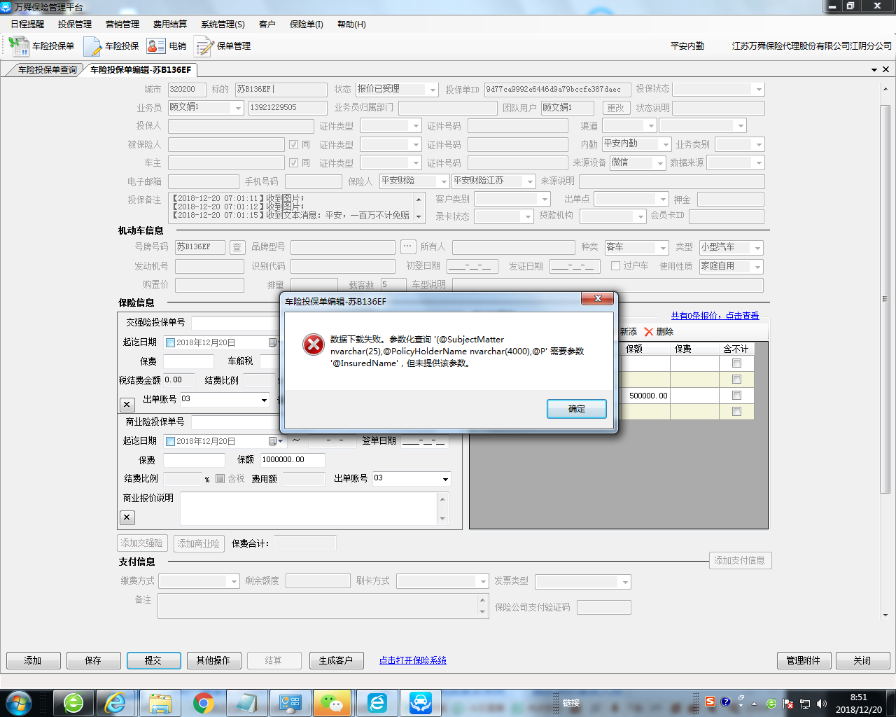 投保单提交到已报价时可以弹出已查询到投保单的提示,但是点击确定时则提示错误。错误提示见附件,提示参数未提供参数。但是使用“从保险公司下载--投保单”是可以正常下载的。