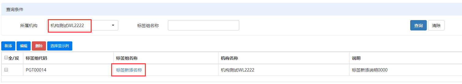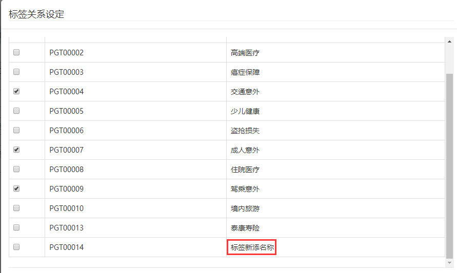 新添的标签机构是测试机构,然后标签组的机构是易保通,点击进入标签关系设定界面,应该不会有测试机构的标签