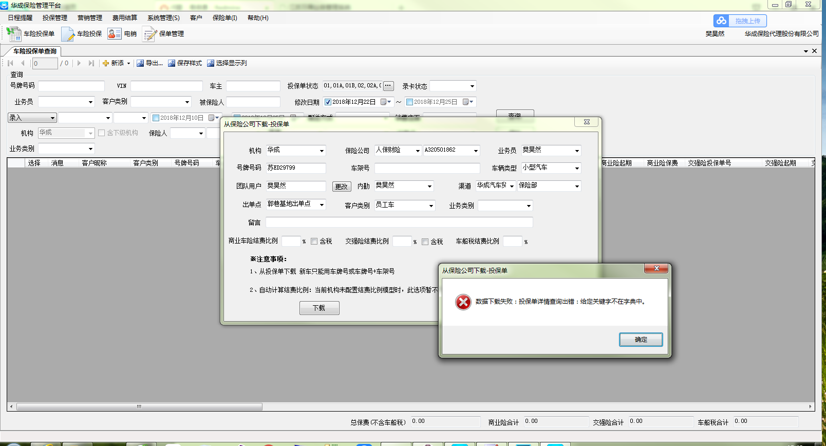 【华成】人保下载投保单失败,提示“查询投保单出错,给定的关键字不在字典中”,但是在人保系统能够查到指定的投保单。