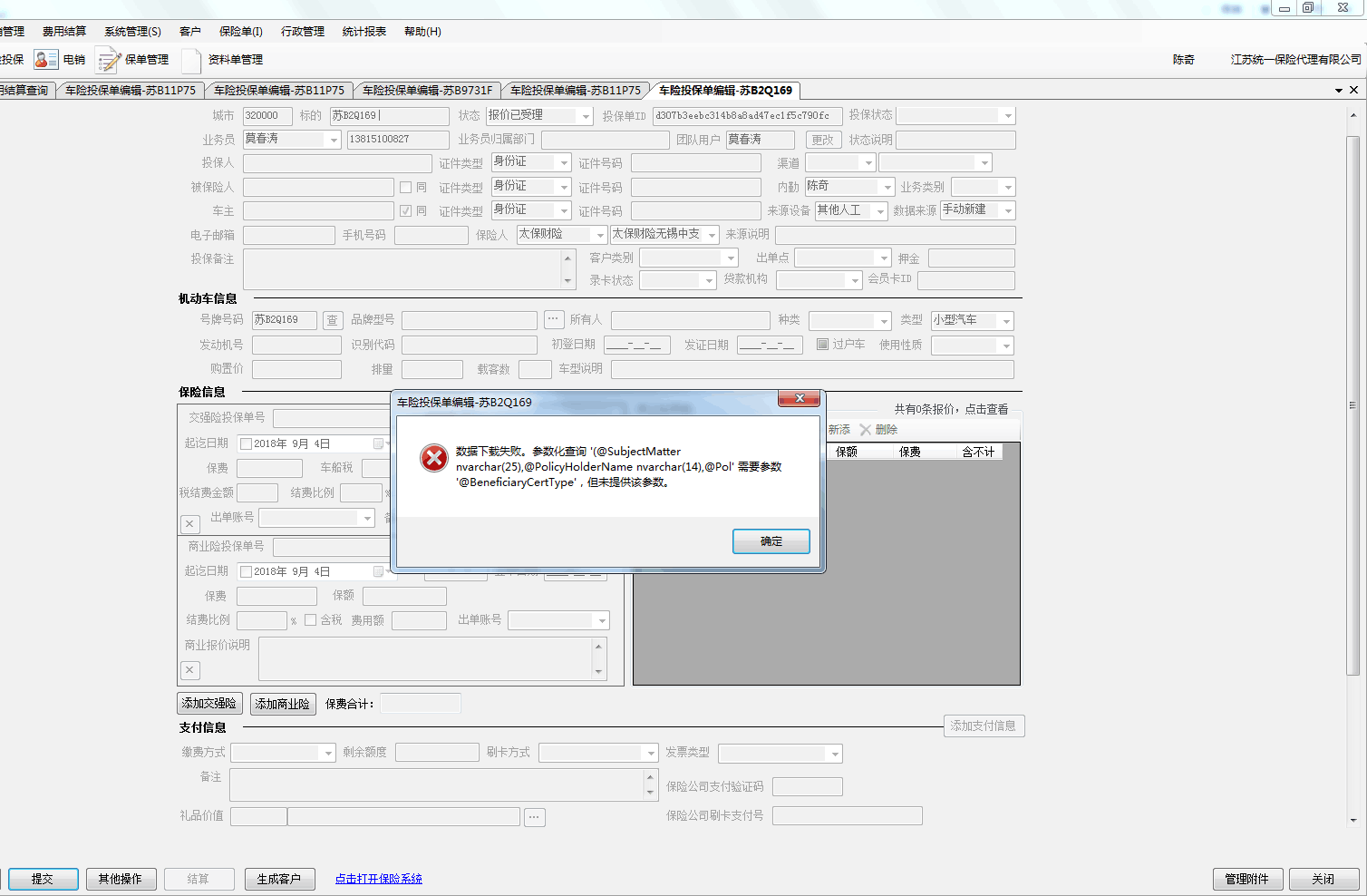 【统一】管理系统,快速新添太保(w_xtydl)投保单,从报价已受理提交到已报价时提示错误“数据下载失败,参数化查询‘(@SubjectMatter nvarchar(25),@PolicyHodlderName nvarchar(14),@pol''@BeneficiaryCertTyoe),’”但未提供该参数。