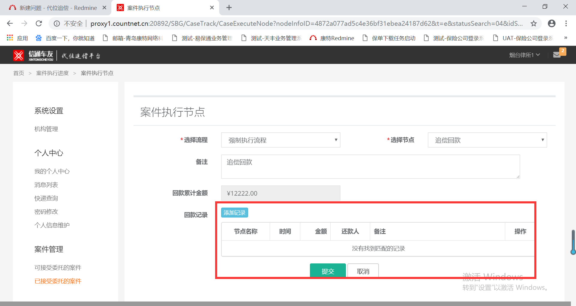 在申请执行流程中,选择强制执行-追偿回款-执行中止,若追偿回款中未添加回款记录,在执行中止节点中添加了回款记录。回头查看追偿回款节点中也有回款累计金额,但是没有回款记录。可参考测试案件:YTBX201901020001