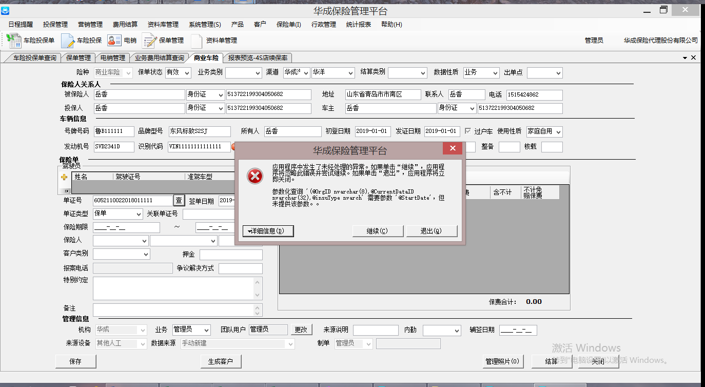 在保单编辑页面填写上保单号之后,点击【查】这是系统会提示报错“需要参数‘@StartDate’单未提供该参数。。”。