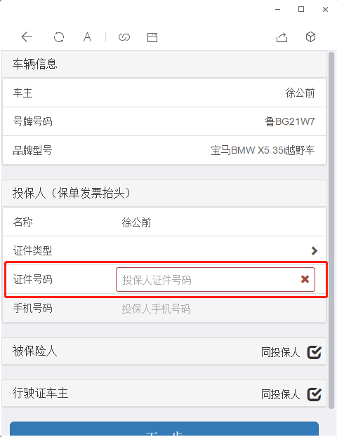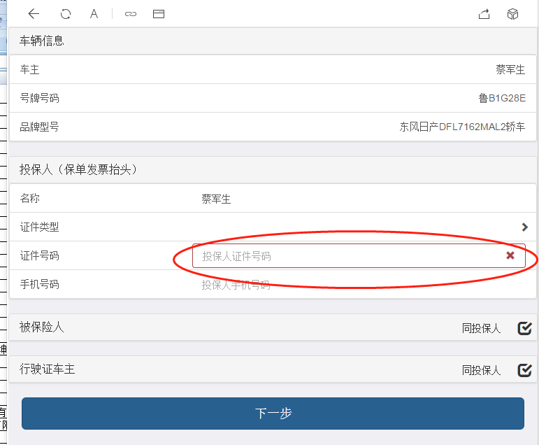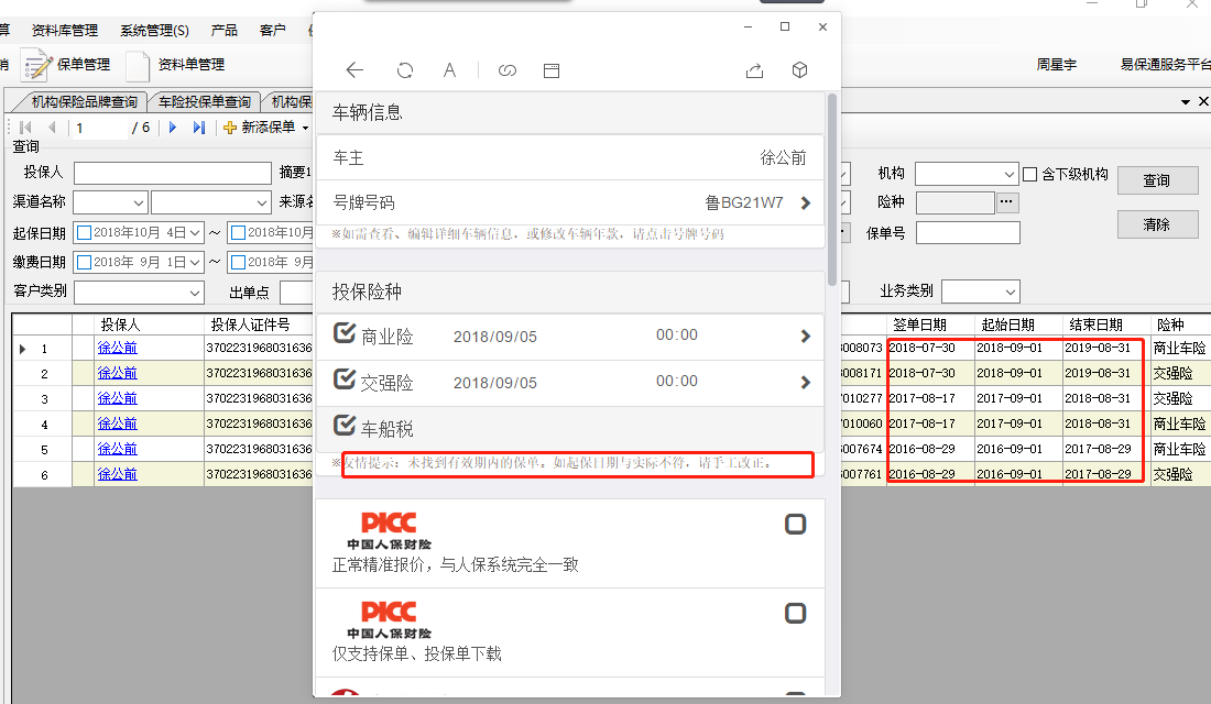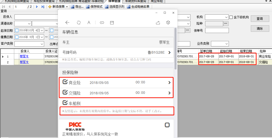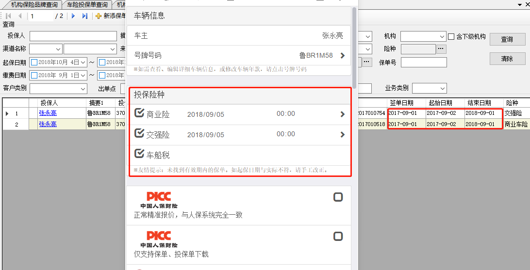 图中车辆在系统中有去年的保单信息,使用系统报价的过程中,如果车辆在保险公司未能获取到续保信息也应该将系统中的保单信息带出来。