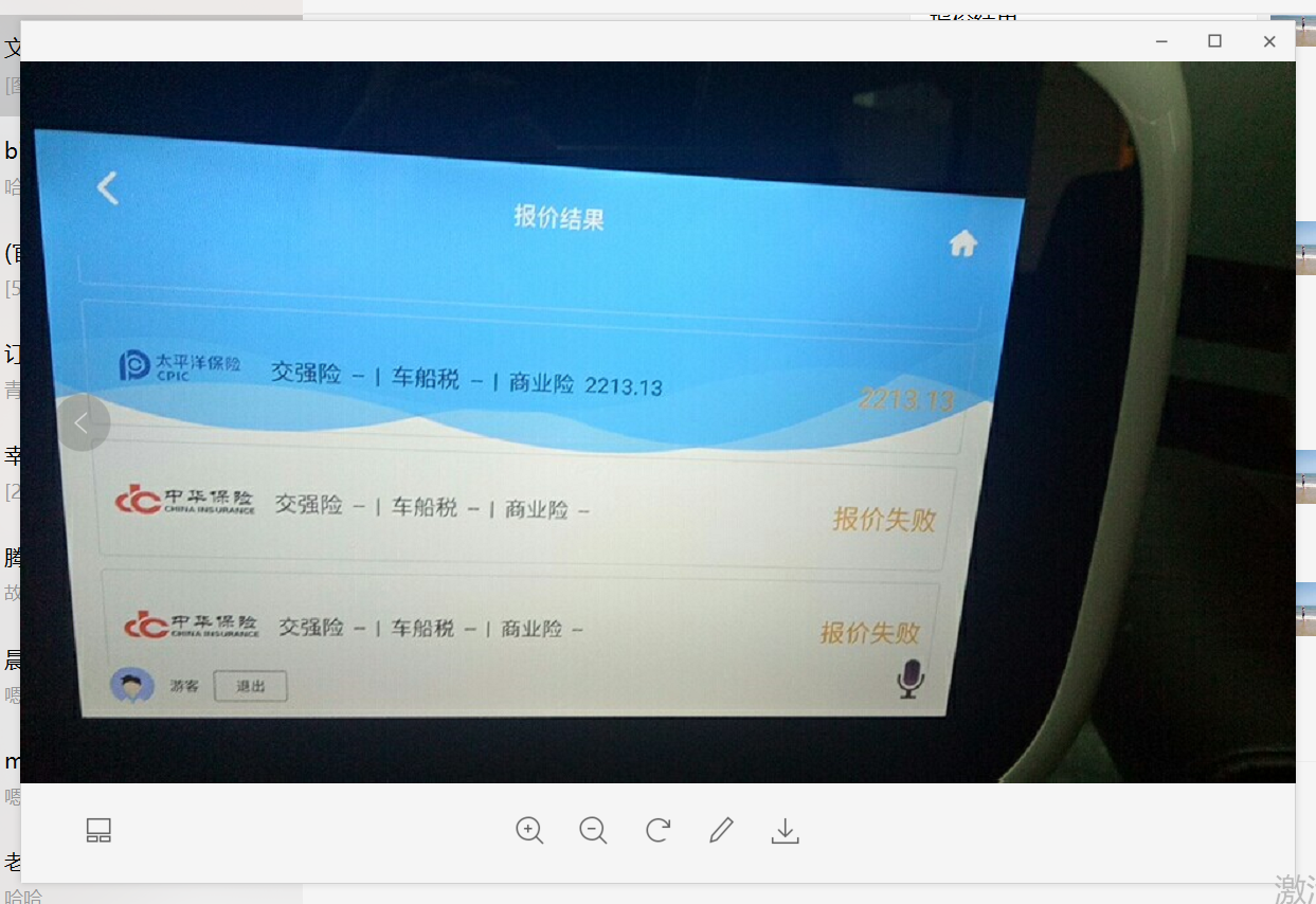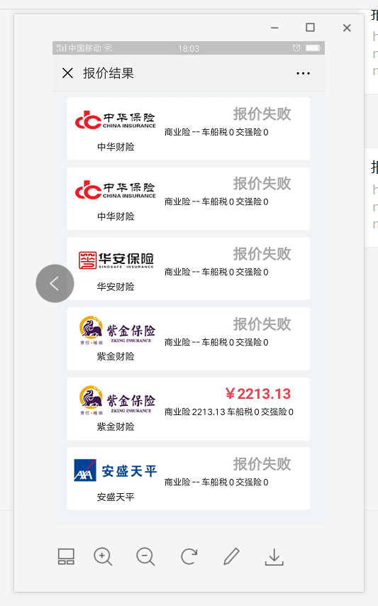 1. 报价完成后,报价成功的是太平洋保险2. 使用微信扫描报价二维码后,查看报价列表,显示的是紫金保险报价成功