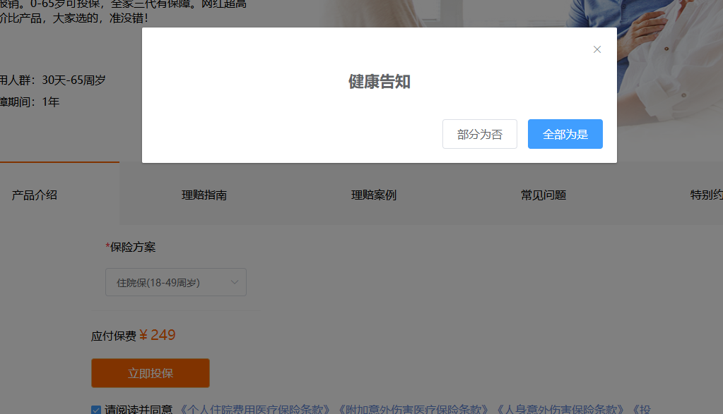 配置问题,在产品方案配置中勾选了健康告知是否可用,但是每天健康告知,所以不显示