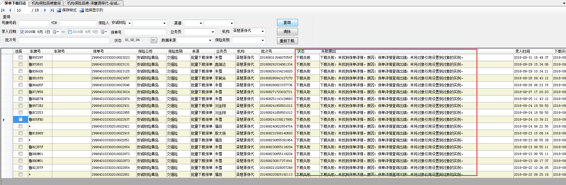 【泽惠园】安诚保险公司下载失败,可以扫描到相应的保单详情但是下载的时候提示:下载失败:未找到保单详情。原因:保单详情查询出错:未将对象引用设置到对象的实例。