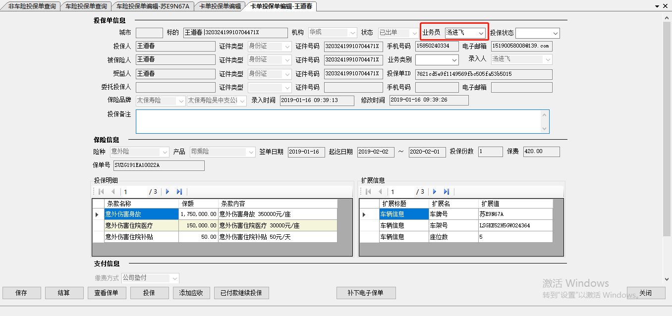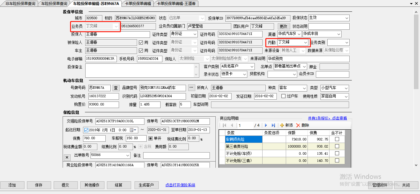内容:在车险投保单页面生成非车险投保单,默认带入的业务员为录入人姓名。