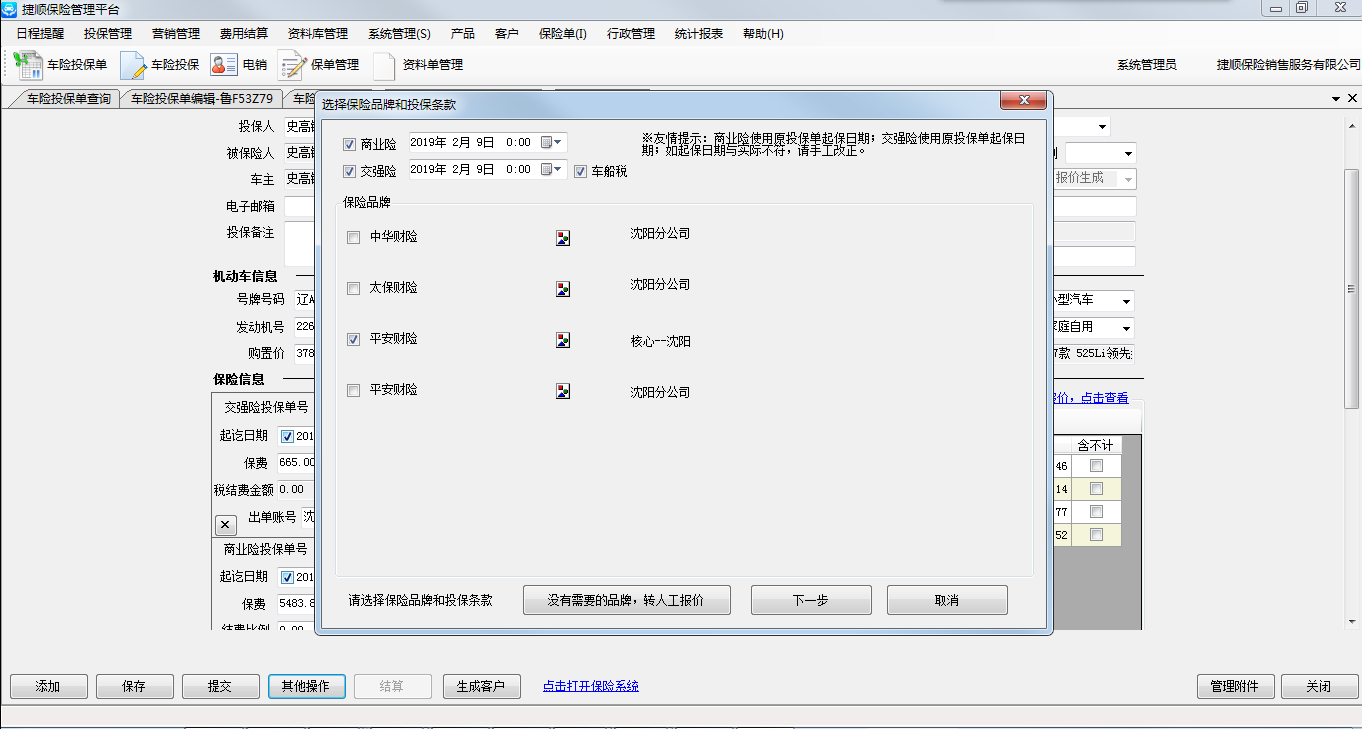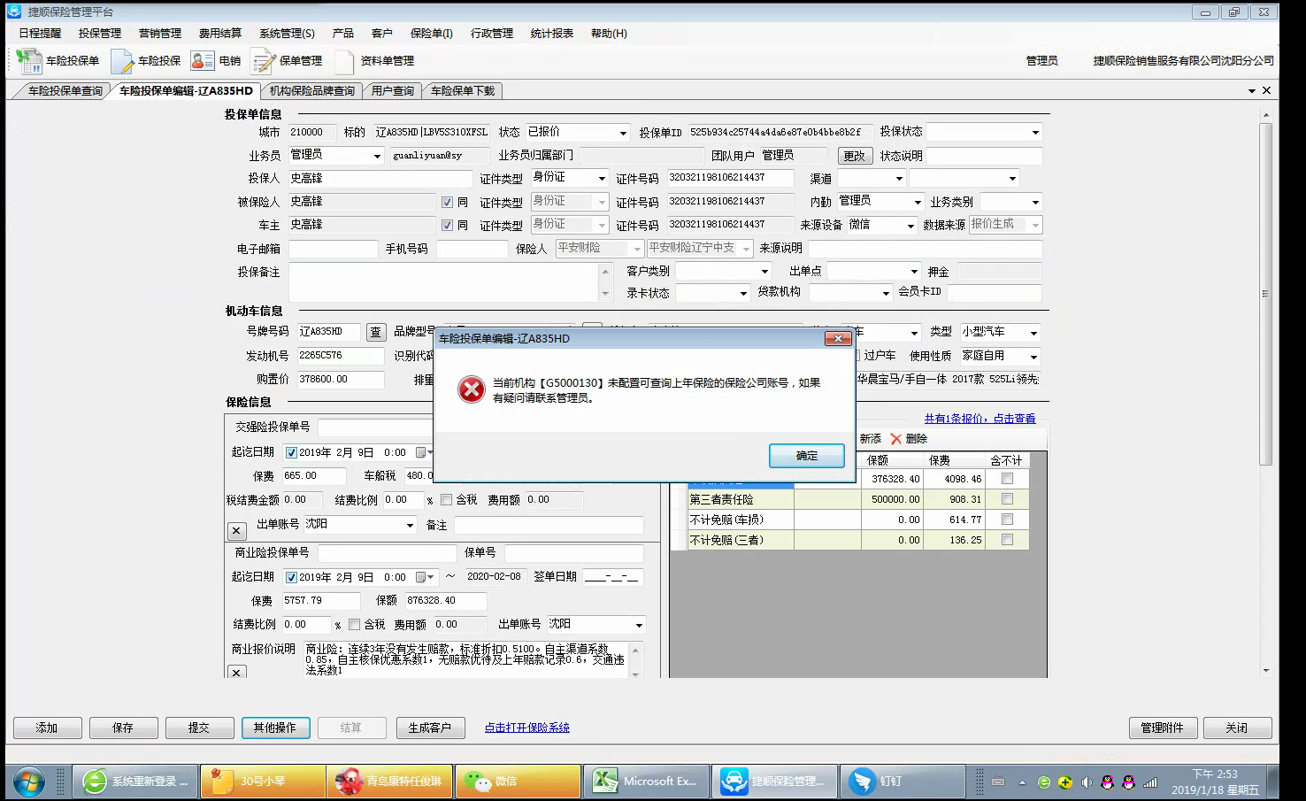 【捷顺】沈阳接口报价时,如果使用沈阳分公司的管理员账号进行报价会提示“机构没有可以查询上年保险信息的账号”但是系统管理员账号报价就可以,同一个投保单ID都 为525b934c25744a4da6e87e0b4bbe8b2f