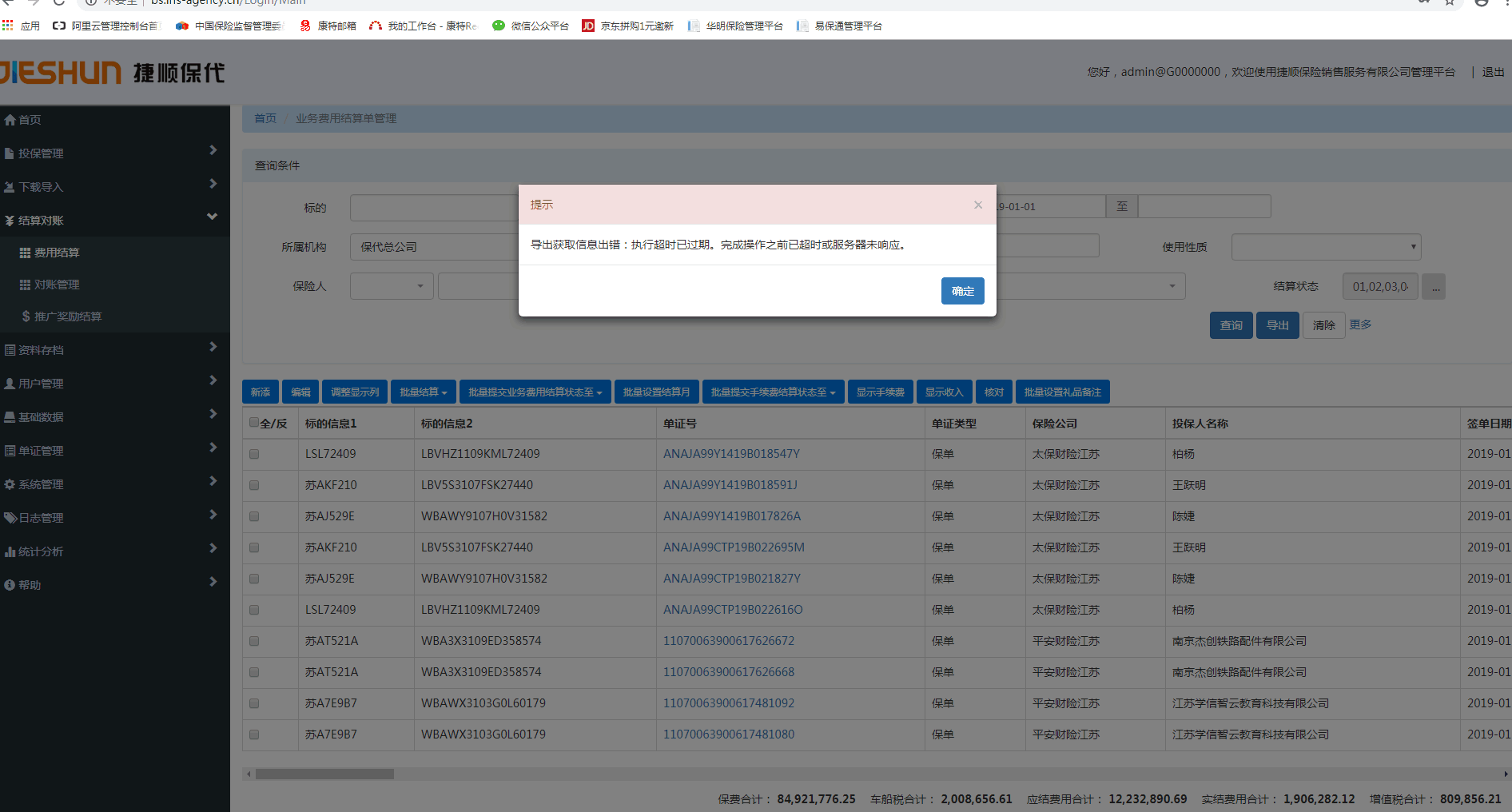 提出人:沈喆信息:账号:admin@G0000000 密码:JIEshun@1232019年一月份所有结算单数据内容:选择2019年一月份所有结算单数据做导出操作时提示执行超时已过期,完成操作之前已超时或服务器未响应。详情见附件。