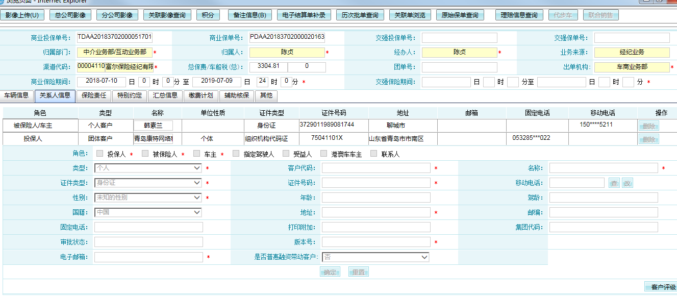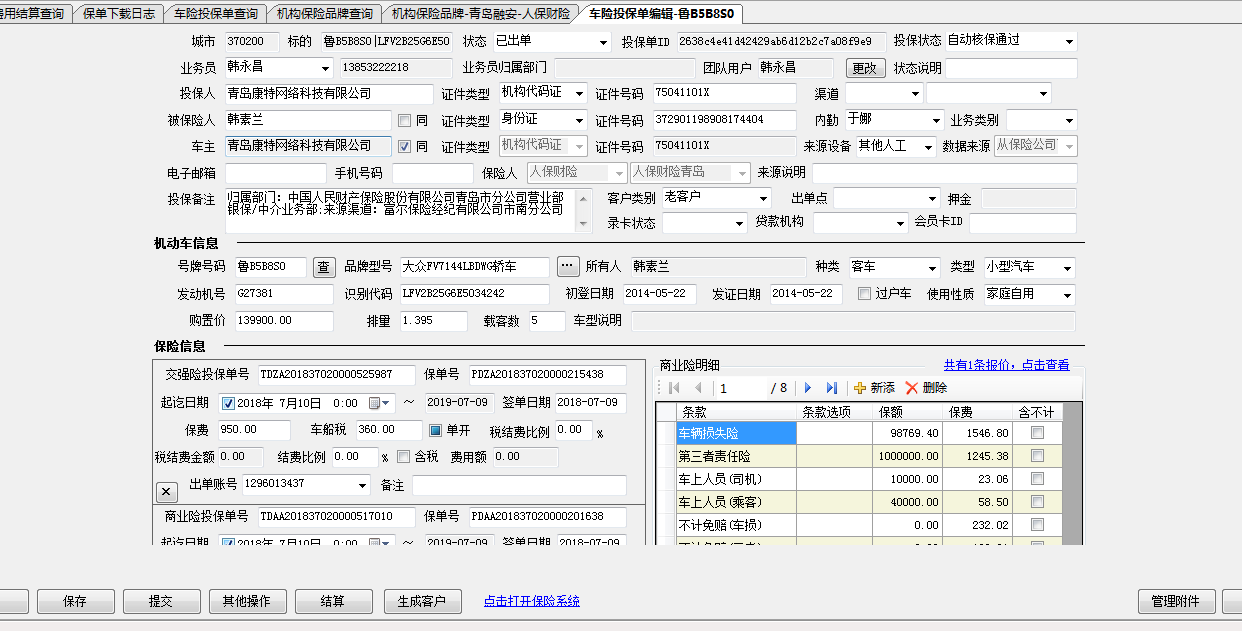 上述车从保险公司下载投保单时生成的投保单数据,车主显示有误。保险公司内的车主和被保险人是韩素兰,但是易保通中显示的车主是青岛康特网络科技有限公司。