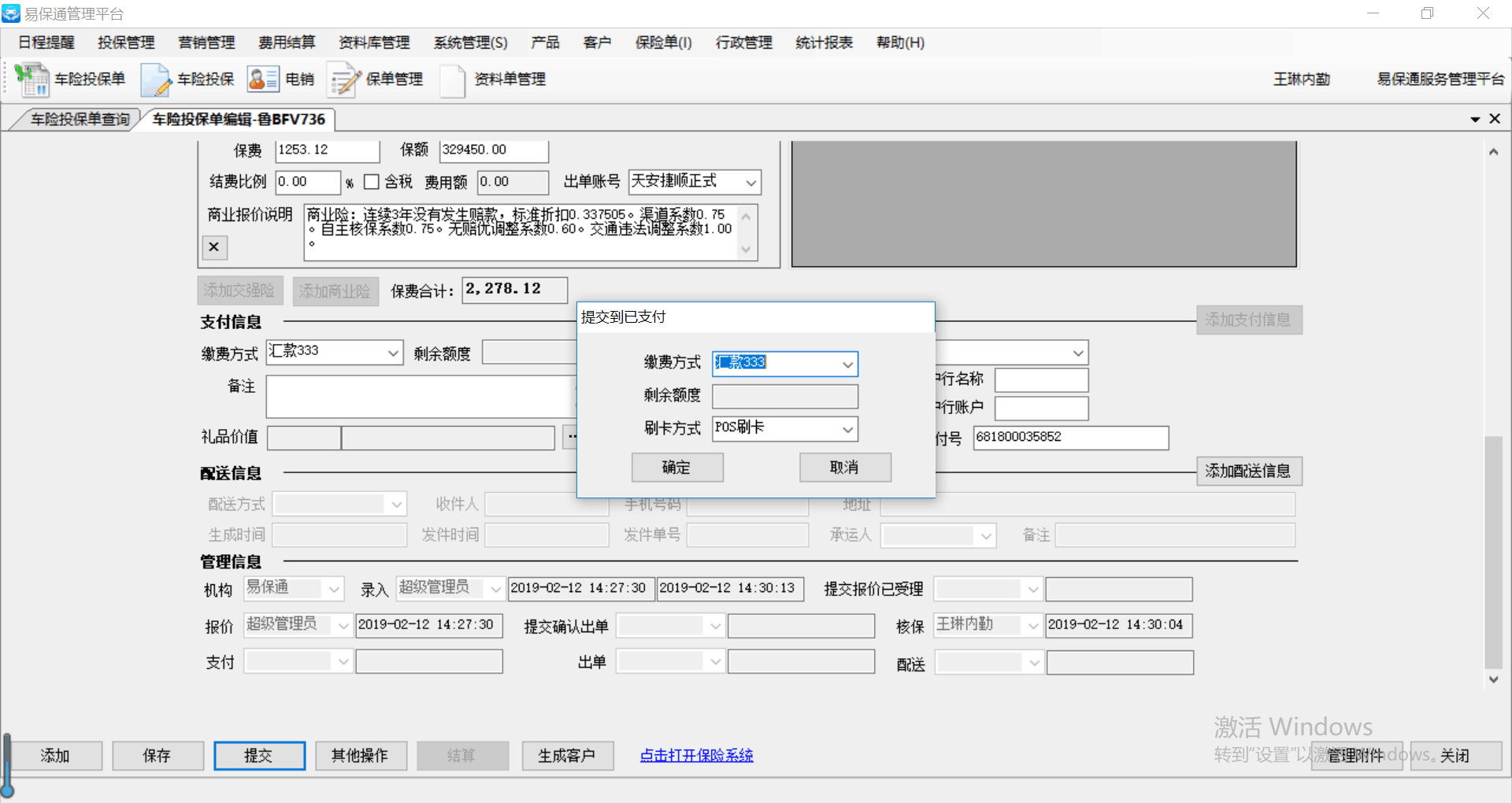 【投保管理】车险投保单,投保单提交到支付待确认时,有支付信息的投保单没有提交到已支付状态,见描述