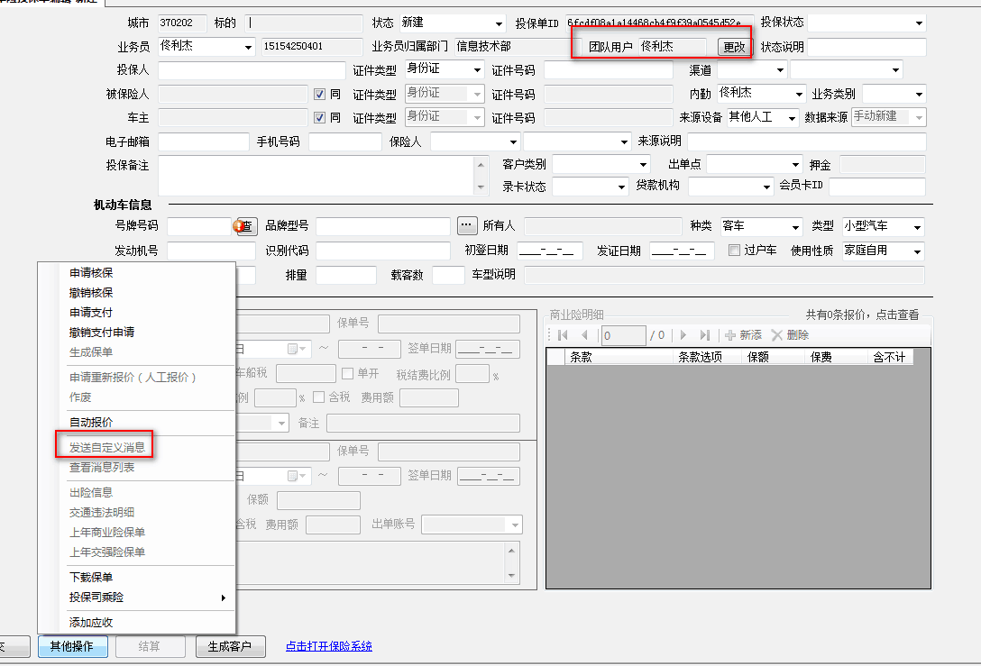 【通用】在新建投保单时,团队用户不能跟着业务员的改变而自动跳 还有就是在初次普通新添投保单时“发送自定义消息”不能使用,是灰色的,点击保存后也不可以,只有在退出后再进入才能使用“发送自定义消息”,能不能直接在新添投保单的时候操作发送自定义消息功能,而不用退出再次进入才能够使用