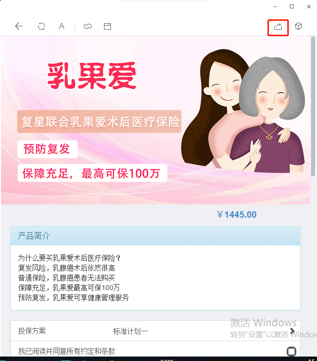 详细信息:公众号:华明保险 健康险产品“乳果爱”,点击右上方分享后,被分享人看不到产品详情,如图2