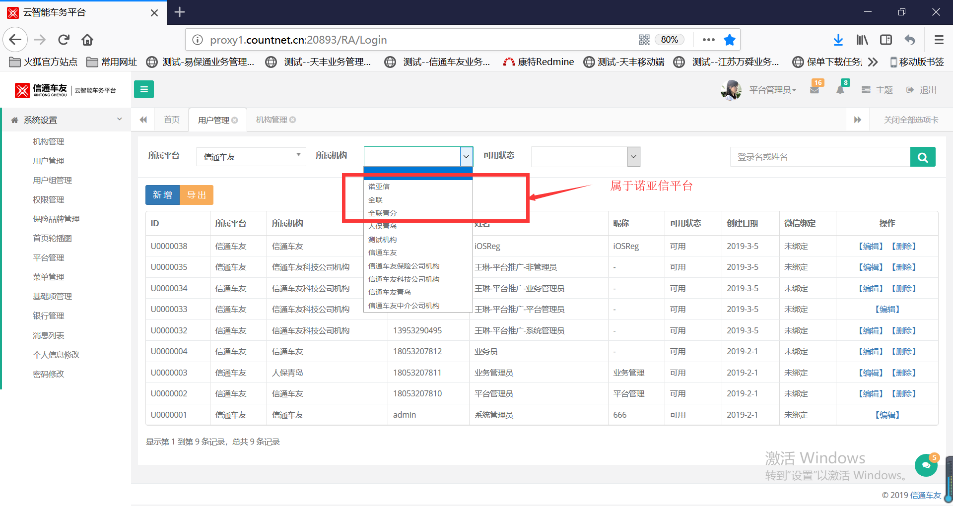 【用户管理】平台管理员登录,用户管理中的机构应该显示该平台下所有机构