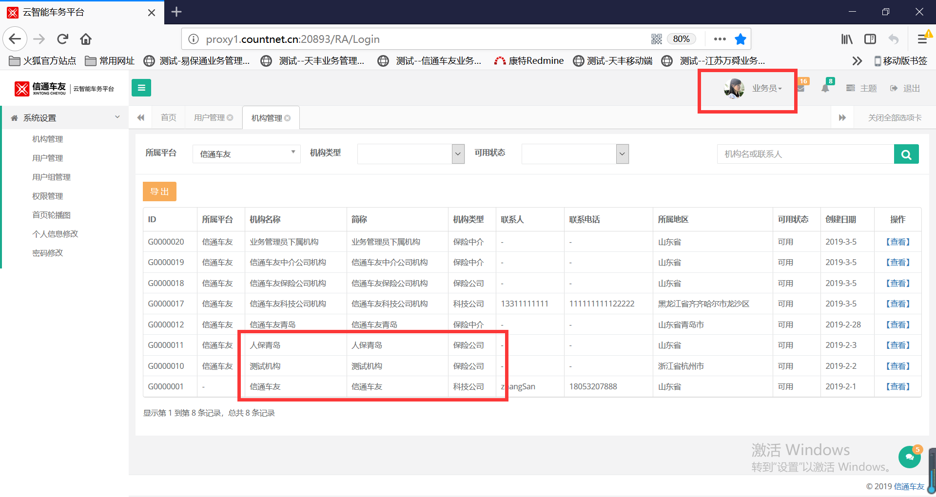查看机构列表,显示的是业务员所属平台下所有机构的数据。