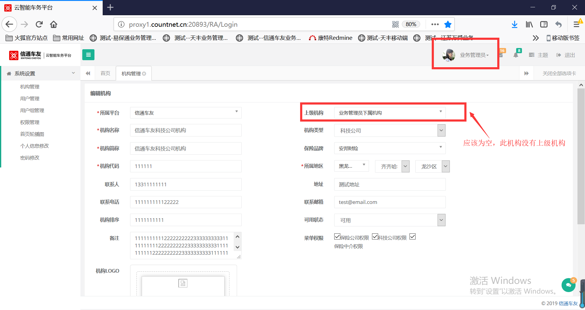 登录后编辑本机构信息,上级机构显示不正确,该机构无上级机构。显示见附图