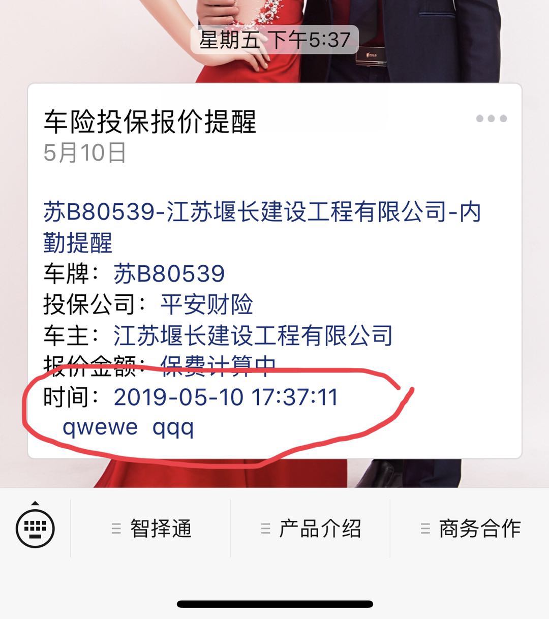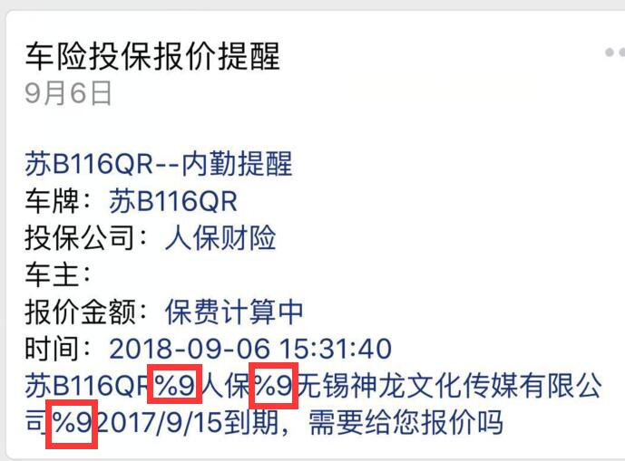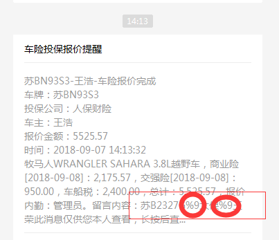 从投保单详情页面中的其他操作—发送自定义消息,填写留言信息时,业务员在微信端看到的空格显示的是“%9”如下图微信端所示。