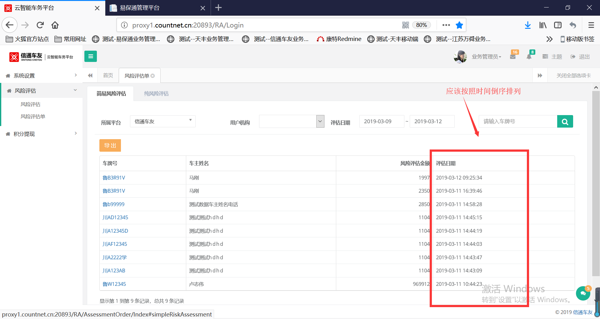2. 业务管理员登录后,风险评估单列表没有按照评估时间倒序排列,见附图