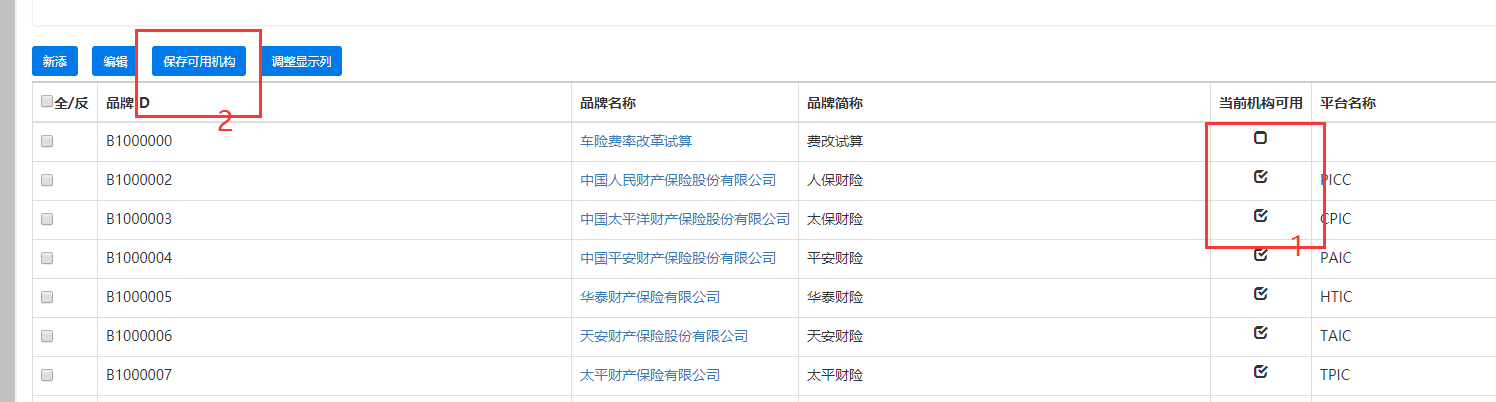操作问题:是否可用需要勾选【当前机构可用】后,再点击【保存可用保险品牌】;如图
