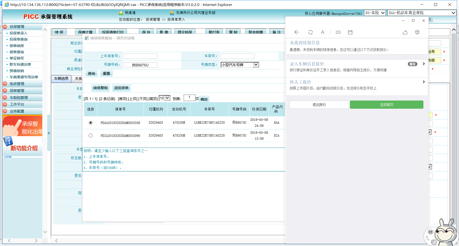 以上车辆2018-2019年在人保承保,使用系统查询续保时,系统无法自动将续保信息带入到系统导致客户报价是只能手动填写车辆信息。