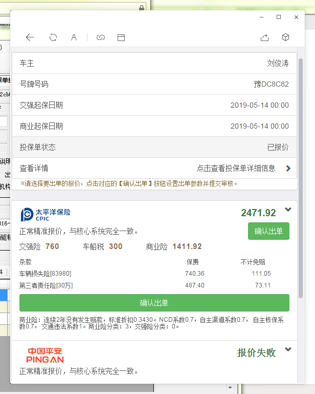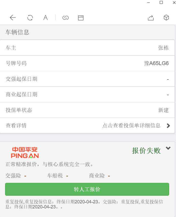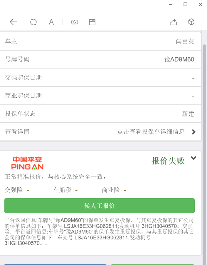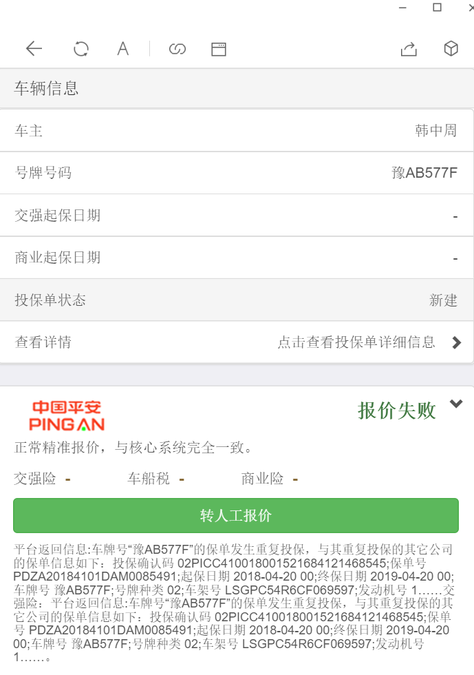 【车易保】河南车易保配置平安报价,报价失败不提示原因。