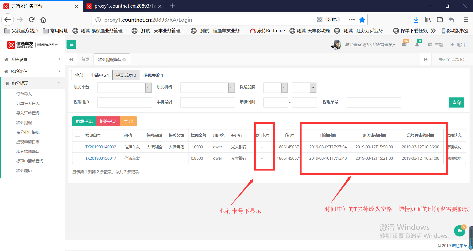 1. 提现银行卡号没显示2. 所有的时间显示问题见附图描述