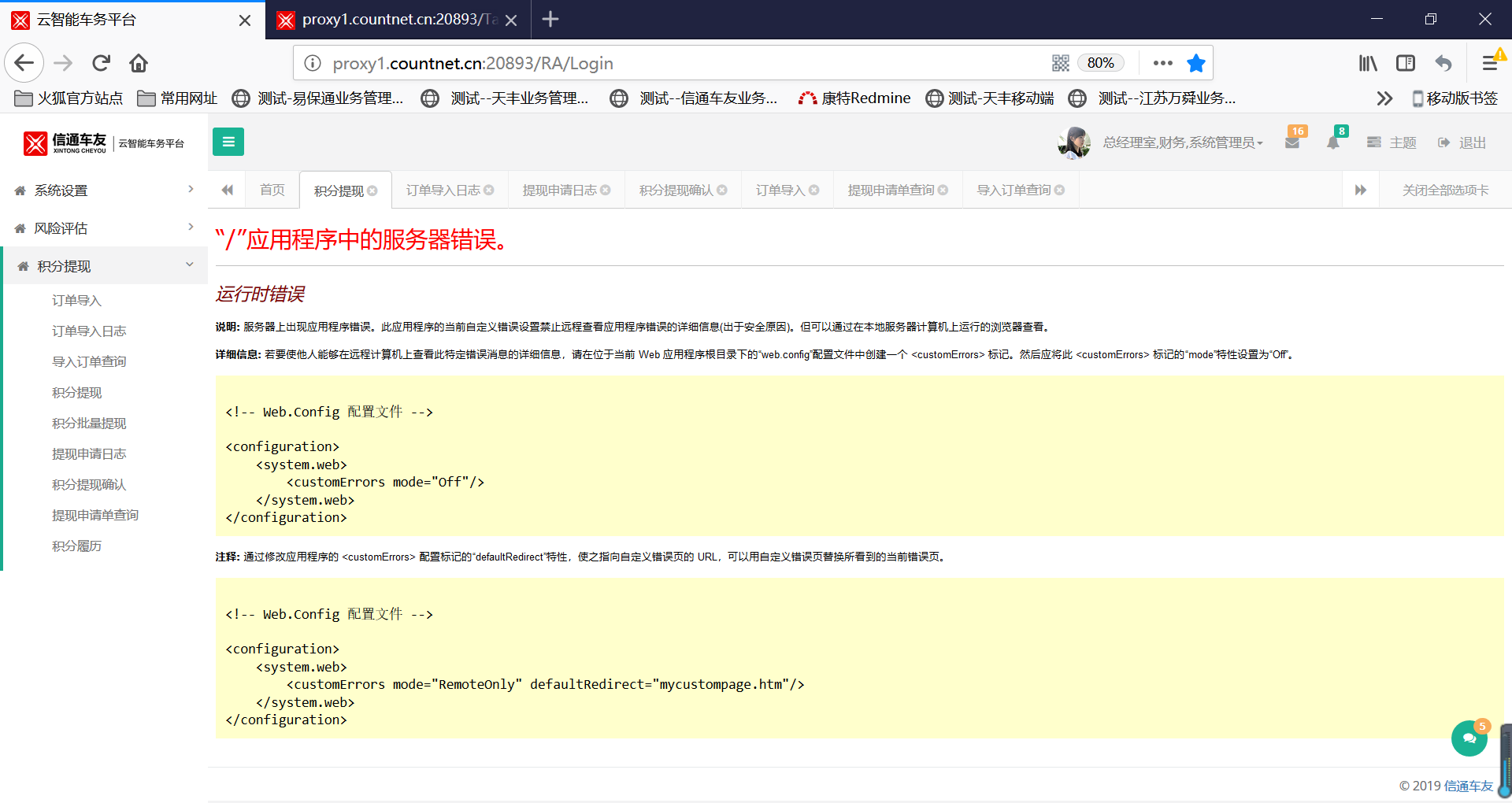 2. 进入订单导入日志,找到该批次的订单,点击提现申请,跳到积分提现页面,提10后,余额显示为90 。此时再点刚刚打开的积分提现标签,页面是不会刷新的,积分仍然显示100,此时提现100会报错,报错见附图