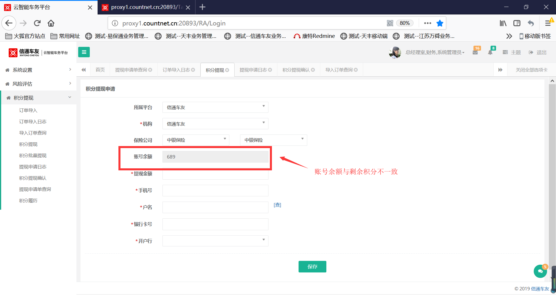 财务拒绝后,积分提现中的账号余额显示不正确。