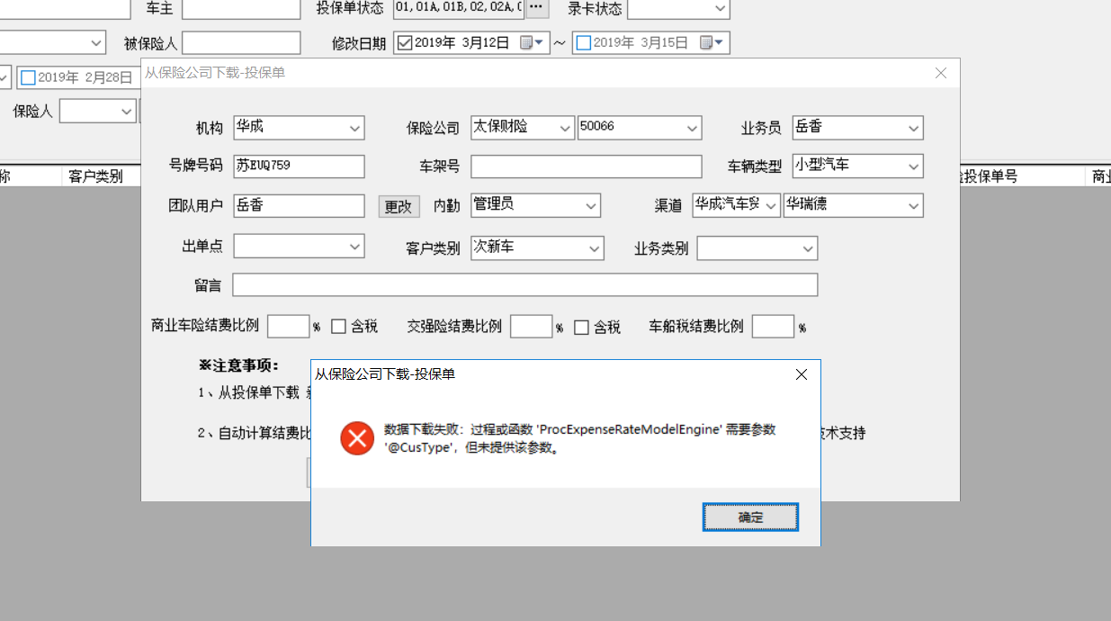 【华成】投保管理—车险投保单—新添—从保险公司下载投保单,太保个别车下载提示过程或函数“proexpenseratemodelengine”需要参数导致下载失败