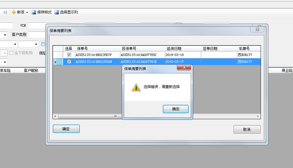 此问题原因:选择的投保单为两张商业险投保单,提示信息提示为选择错误,请进行修改,提示信息不够明确。