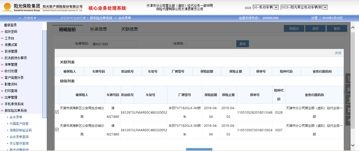 内容:测试续保带出过程中,在阳光系统中可根据车牌号或车架号必填其一即可查出车辆上年续保信息。